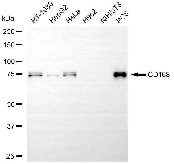 Western blotting analysis using CD168 antibody. Total cell lysates (30 μg) from various cell lines were loaded and separated by SDS-PAGE. The blot was incubated with CD168 antibody and HRP-conjugated goat anti-rabbit secondary antibody respectively.