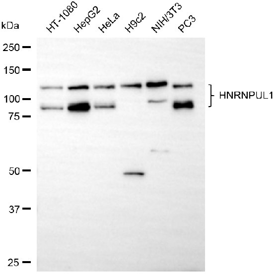 Western blotting analysis using HNRNPUL1 antibody. Total cell lysates (30 μg) from various cell lines were loaded and separated by SDS-PAGE. The blot was incubated with HNRNPUL1 antibody and HRP-conjugated goat anti-rabbit secondary antibody respectively.