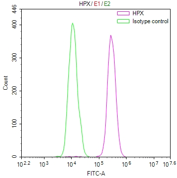 Overlay Peak curve showing HepG2 cells stained with CSB-RA777092A0HU (red line) at 1:100. The cells were fixed in 4% formaldehyde and permeated by 0.2% TritonX-100 for 10min. Then 10% normal goat serum to block non-specific protein-protein interactions followed by the antibody (1ug/1*106cells) for 45min at 4℃. The secondary antibody used was FITC-conjugated goat anti-rabbit IgG (H+L) at 1/200 dilution for 35min at 4℃.Control antibody (green line) was Rabbit IgG (1ug/1*106cells) used under the same conditions. Acquisition of >10,000 events was performed.