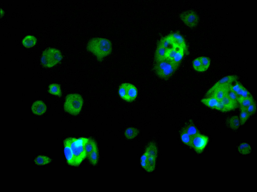 Immunofluorescence staining of HepG2 cell with CSB-RA777092A0HU at 1:50, counter-stained with DAPI. The cells were fixed in 4% formaldehyde, permeabilized using 0.2% Triton X-100 and blocked in 10% normal Goat Serum. The cells were then incubated with the antibody overnight at 4°C. The secondary antibody was Alexa Fluor 488-congugated AffiniPure Goat Anti-Rabbit IgG(H+L).