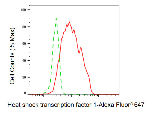 Flow cytometric analysis of heat shock transcription factor 1 expression in HepG2 cells using heat shock transcription factor 1 antibody. Green, isotype control; red, heat shock transcription factor 1.