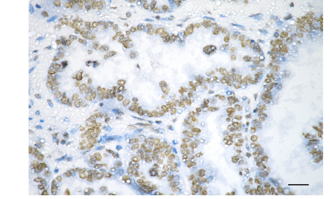 Immunohistochemistry was performed on paraffin-embedded human ovarian carcinoma using heat shock transcription factor 1 antibody. Antigen retrieval was done in sodium citrate buffer (pH 6.0). DAB was used for detection, with hematoxylin counterstaining. Images were acquired using a Nikon Ci-L Plus microscope (40× objective). Scale bar: 25 μm.
