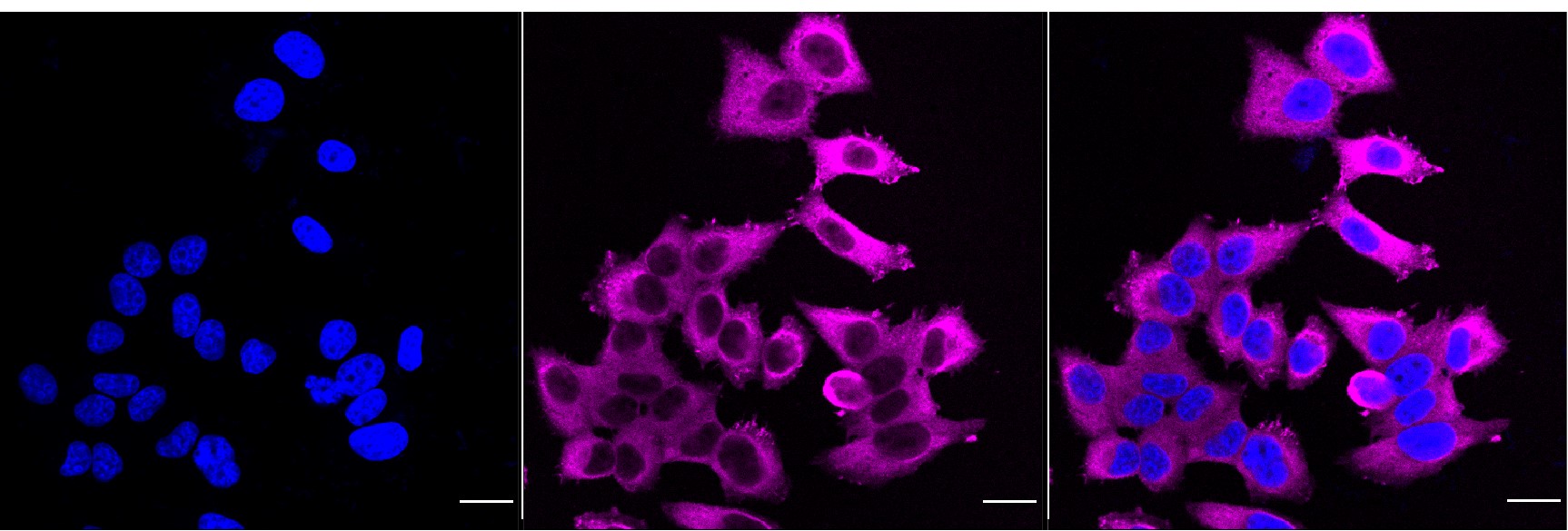 Immunocytochemical staining of HepG2 cells with Hsp90 beta antibody. Nuclei were stained blue with DAPI; Hsp90 beta was stained magenta with Alexa Fluor? 647. Images were taken using Leica stellaris 5. Protein abundance based on laser Intensity and smart gain: High. Scale bar, 20 μm.