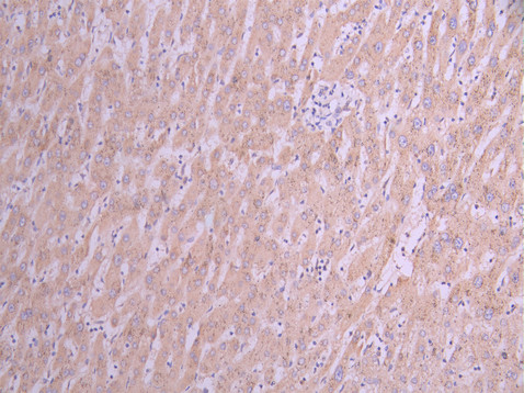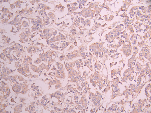 IHC image of CSB-RA010827MA1HU diluted at 1:50 and staining in paraffin-embedded human liver cancer performed on a Leica BondTM system. After dewaxing and hydration, antigen retrieval was mediated by high pressure in a citrate buffer (pH 6.0). Section was blocked with 10% normal goat serum 30min at RT. Then primary antibody (1% BSA) was incubated at 4°C overnight. The primary is detected by a Anti-Human lgG, Fcy Fragment Specific labeled by HRP and visualized using 0.05% DAB.