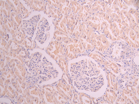 IHC image of CSB-RA010827MA1HU diluted at 1:50 and staining in paraffin-embedded human kidney tissue performed on a Leica BondTM system. After dewaxing and hydration, antigen retrieval was mediated by high pressure in a citrate buffer (pH 6.0). Section was blocked with 10% normal goat serum 30min at RT. Then primary antibody (1% BSA) was incubated at 4°C overnight. The primary is detected by a Anti-Human lgG, Fcy Fragment Specific labeled by HRP and visualized using 0.05% DAB.