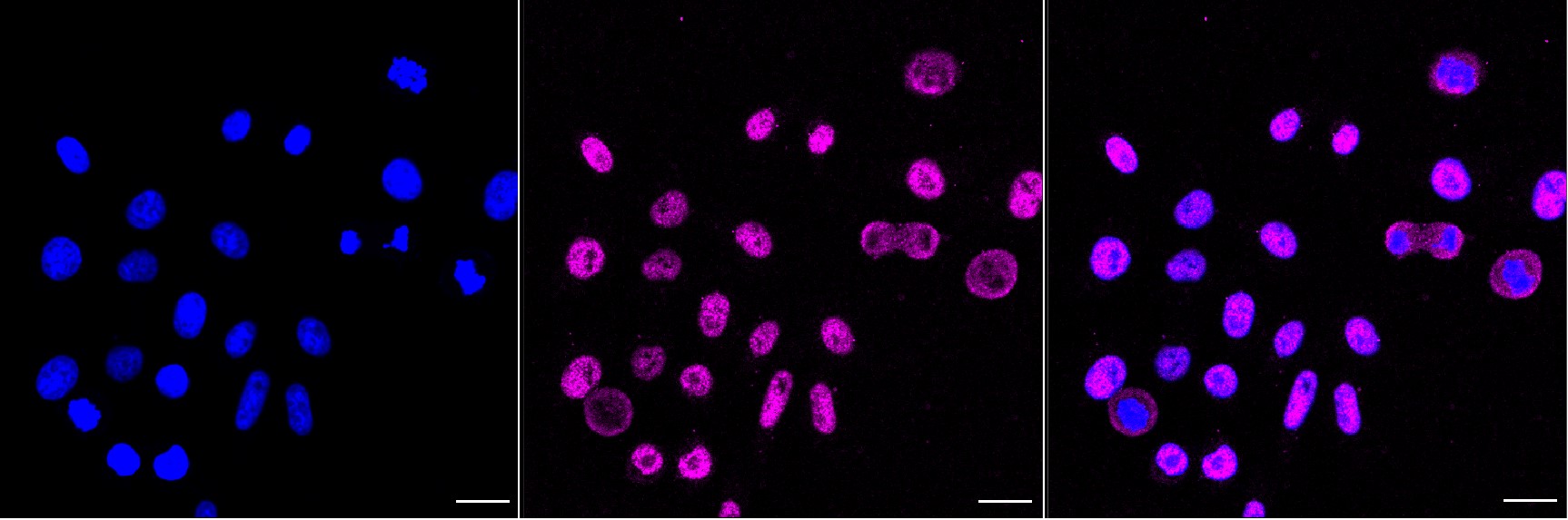 Immunocytochemical staining of HepG2 cells with Grp75 antibody. Nuclei were stained blue with DAPI; Grp75 was stained magenta with Alexa Fluor? 647. Images were taken using Leica stellaris 5. Protein abundance based on laser Intensity and smart gain: Medium. Scale bar, 20 μm.