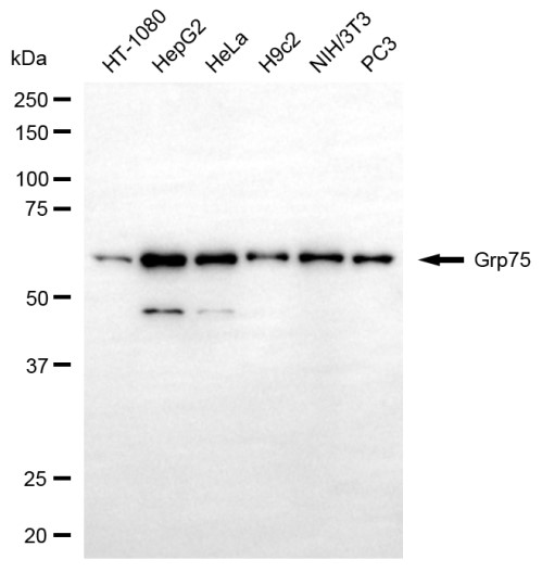 Western blotting analysis using Grp75 antibody. Total cell lysates (30 μg) from various cell lines were loaded and separated by SDS-PAGE. The blot was incubated with Grp75 antibody and HRP-conjugated goat anti-rabbit secondary antibody respectively.