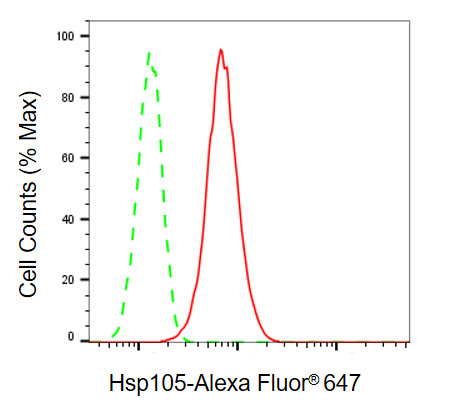 Flow cytometric analysis of Hsp105 expression in HT-1080 cells using Hsp105 antibody. Green, isotype control; red, Hsp105.