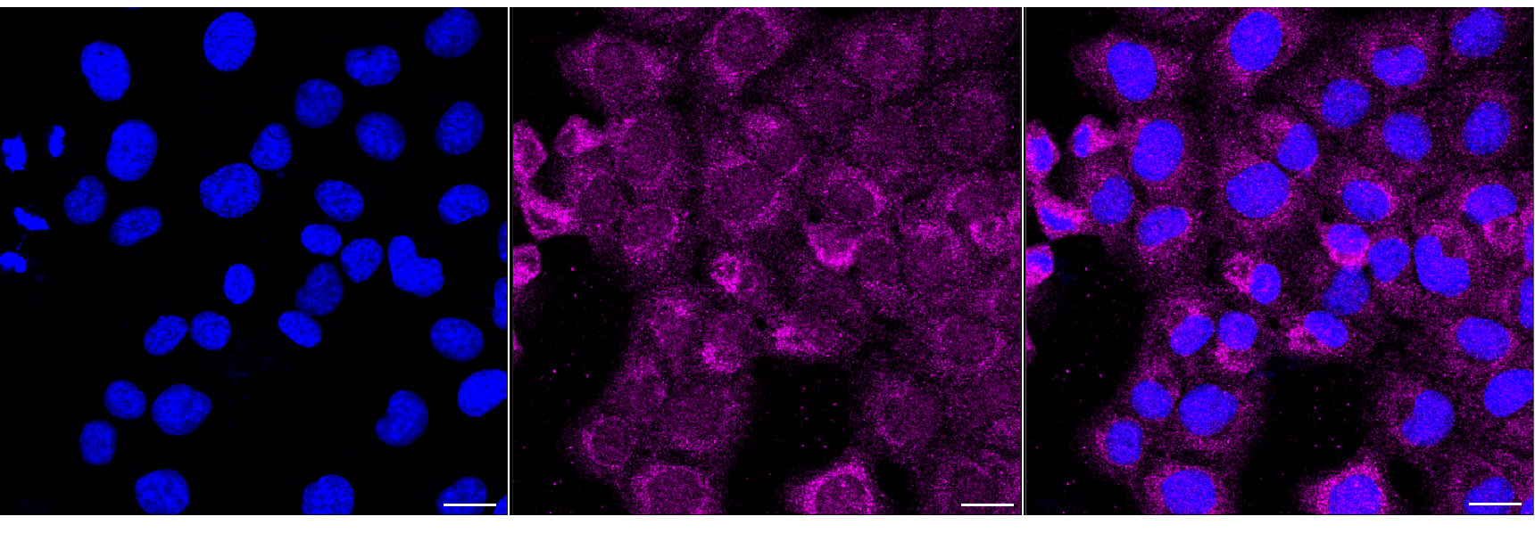 Immunocytochemical staining of HT-1080 cells with Hsp105 antibody. Nuclei were stained blue with DAPI; Hsp105 was stained magenta with Alexa Fluor? 647. Images were taken using Leica stellaris 5. Protein abundance based on laser Intensity and smart gain: Medium. Scale bar, 20 μm.