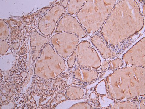 IHC image of CSB-RA824594A0HU diluted at 1:100 and staining in paraffin-embedded human thyroid tissue performed on a Leica BondTM system. After dewaxing and hydration, antigen retrieval was mediated by high pressure in a citrate buffer (pH 6.0). Section was blocked with 10% normal goat serum 30min at RT. Then primary antibody (1% BSA) was incubated at 4°C overnight. The primary is detected by a Goat anti-rabbit polymer IgG labeled by HRP and visualized using 0.05% DAB.
