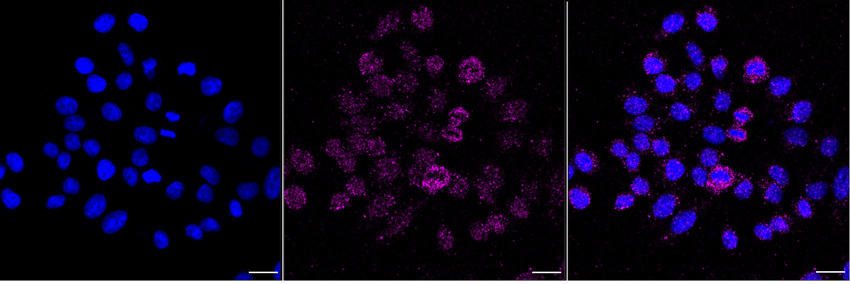 Immunocytochemical staining of HepG2 cells with IFIH1 antibody. Nuclei were stained blue with DAPI; IFIH1 was stained magenta with Alexa Fluor? 647. Images were taken using Leica stellaris 5. Protein abundance based on laser Intensity and smart gain: Medium. Scale bar, 20 μm.