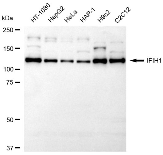 Western blotting analysis using IFIH1 antibody. Total cell lysates (30 μg) from various cell lines were loaded and separated by SDS-PAGE. The blot was incubated with IFIH1 antibody and HRP-conjugated goat anti-rabbit secondary antibody respectively.