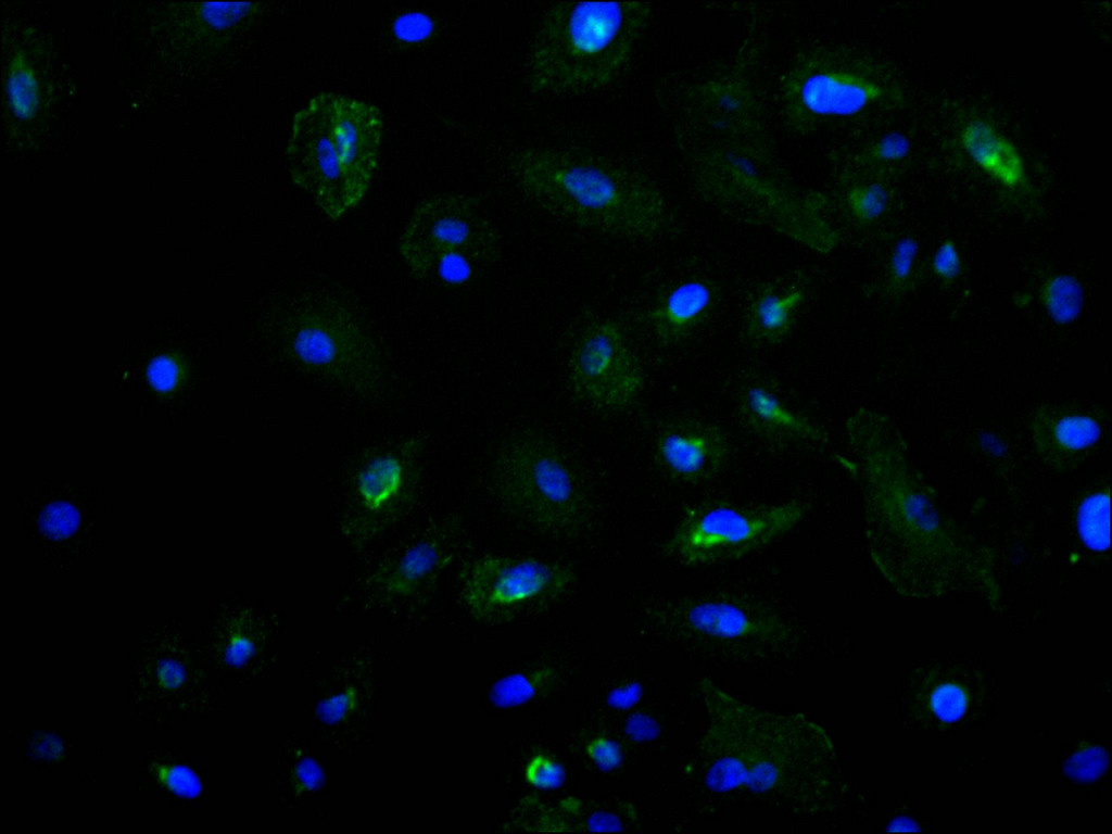 Immunofluorescence staining of A549 cell with CSB-RA966884A0HU at 1:50, counter-stained with DAPI. The cells were fixed in 4% formaldehyde, permeabilized using 0.2% Triton X-100 and blocked in 10% normal Goat Serum. The cells were then incubated with the antibody overnight at 4°C. The secondary antibody was Alexa Fluor 488-congugated AffiniPure Goat Anti-Rabbit IgG(H+L).