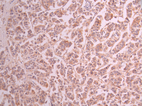 IHC image of CSB-RA966884A0HU diluted at 1:100 and staining in paraffin-embedded human breast cancer performed on a Leica BondTM system. After dewaxing and hydration, antigen retrieval was mediated by high pressure in a citrate buffer (pH 6.0). Section was blocked with 10% normal goat serum 30min at RT. Then primary antibody (1% BSA) was incubated at 4°C overnight. The primary is detected by a Goat anti-rabbit polymer IgG labeled by HRP and visualized using 0.05% DAB.