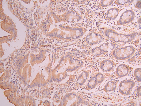 IHC image of CSB-RA966884A0HU diluted at 1:100 and staining in paraffin-embedded human small intestine tissue performed on a Leica BondTM system. After dewaxing and hydration, antigen retrieval was mediated by high pressure in a citrate buffer (pH 6.0). Section was blocked with 10% normal goat serum 30min at RT. Then primary antibody (1% BSA) was incubated at 4°C overnight. The primary is detected by a Goat anti-rabbit polymer IgG labeled by HRP and visualized using 0.05% DAB.