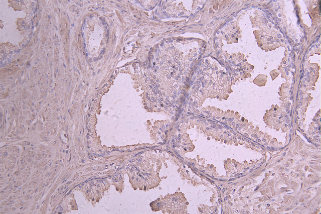 IHC image of CSB-RA011586MA1HU diluted at 1:50 and staining in paraffin-embedded human prostate cancer performed on a Leica BondTM system. After dewaxing and hydration, antigen retrieval was mediated by high pressure in a citrate buffer (pH 6.0). Section was blocked with 10% normal goat serum 30min at RT. Then primary antibody (1% BSA) was incubated at 4°C overnight. The primary is detected by a Goat anti-human polymer IgG labeled by HRP and visualized using 0.05% DAB.
