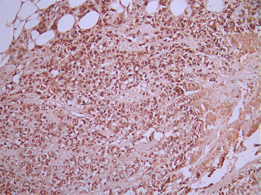 IHC image of CSB-RA145432A0HU diluted at 1:100 and staining in paraffin-embedded human breast cancer performed on a Leica BondTM system. After dewaxing and hydration, antigen retrieval was mediated by high pressure in a citrate buffer (pH 6.0). Section was blocked with 10% normal goat serum 30min at RT. Then primary antibody (1% BSA) was incubated at 4°C overnight. The primary is detected by a Goat anti-rabbit polymer IgG labeled by HRP and visualized using 0.05% DAB.