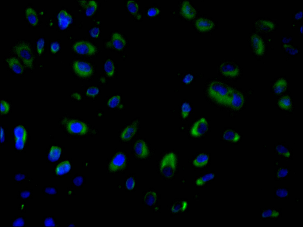 Immunofluorescence staining of Hela cell with CSB-RA921088A0HU at 1:50, counter-stained with DAPI. The cells were fixed in 4% formaldehyde and blocked in 10% normal Goat Serum. The cells were then incubated with the antibody overnight at 4°C. The secondary antibody was Alexa Fluor 488-congugated AffiniPure Goat Anti-Rabbit IgG(H+L).