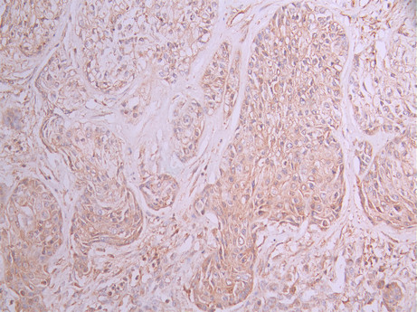 IHC image of CSB-RA921088A0HU diluted at 1:100 and staining in paraffin-embedded human pancreatic cancer performed on a Leica BondTM system. After dewaxing and hydration, antigen retrieval was mediated by high pressure in a citrate buffer (pH 6.0). Section was blocked with 10% normal goat serum 30min at RT. Then primary antibody (1% BSA) was incubated at 4°C overnight. The primary is detected by a Goat anti-rabbit polymer IgG labeled by HRP and visualized using 0.05% DAB.