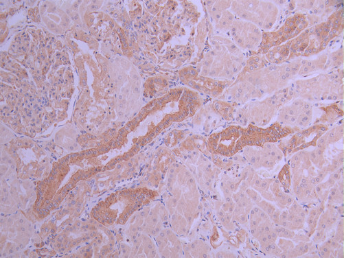 IHC image of CSB-RA921088A0HU diluted at 1:100 and staining in paraffin-embedded human kidney tissue performed on a Leica BondTM system. After dewaxing and hydration, antigen retrieval was mediated by high pressure in a citrate buffer (pH 6.0). Section was blocked with 10% normal goat serum 30min at RT. Then primary antibody (1% BSA) was incubated at 4°C overnight. The primary is detected by a Goat anti-rabbit polymer IgG labeled by HRP and visualized using 0.05% DAB.