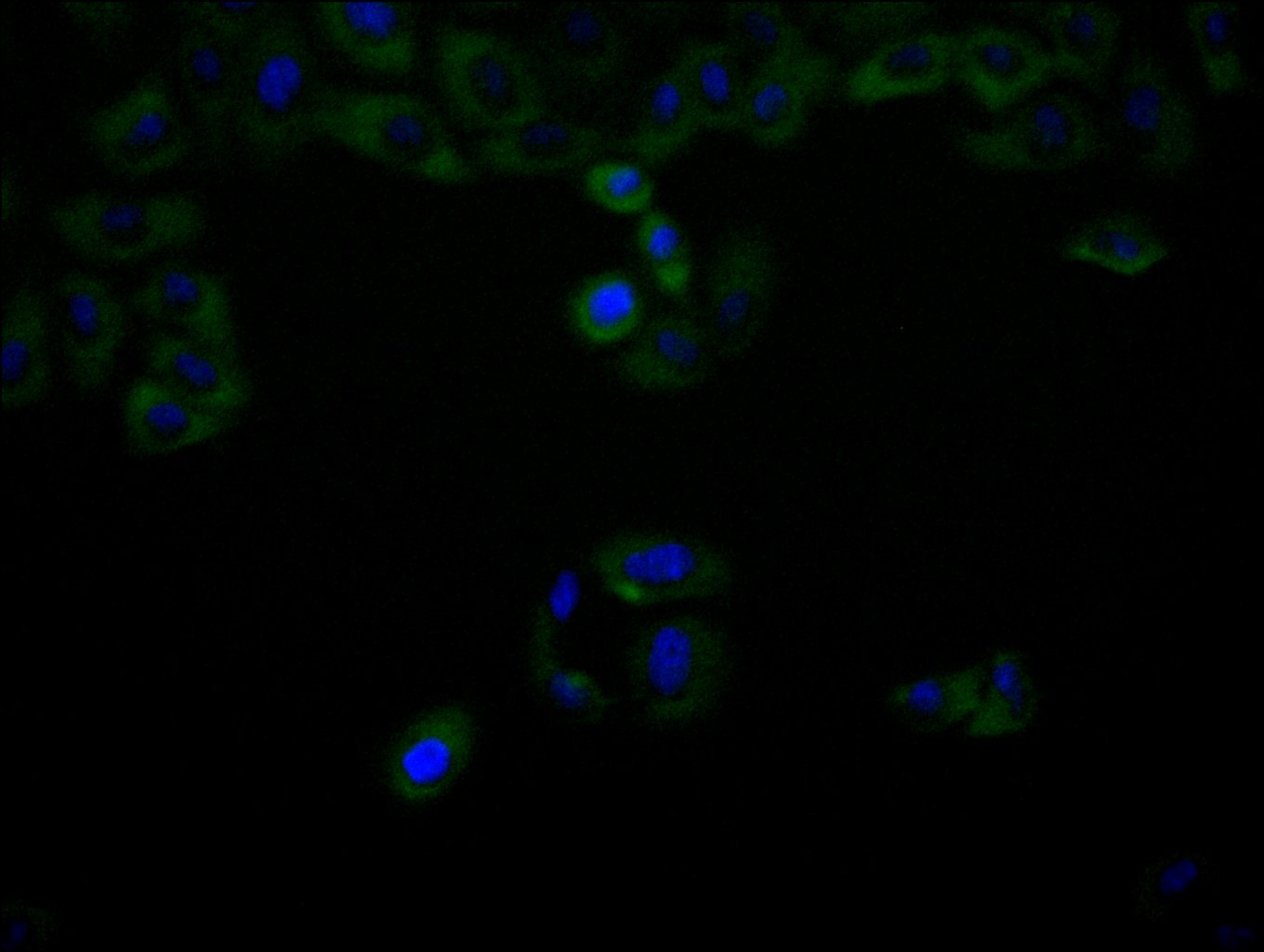 Immunofluorescence staining of Hela cell with CSB-RA563572A0HU at 1:50, counter-stained with DAPI. The cells were fixed in 4% formaldehyde, permeabilized using 0.2% Triton X-100 and blocked in 10% normal Goat Serum. The cells were then incubated with the antibody overnight at 4°C. The secondary antibody was Alexa Fluor 488-congugated AffiniPure Goat Anti-Rabbit IgG(H+L).