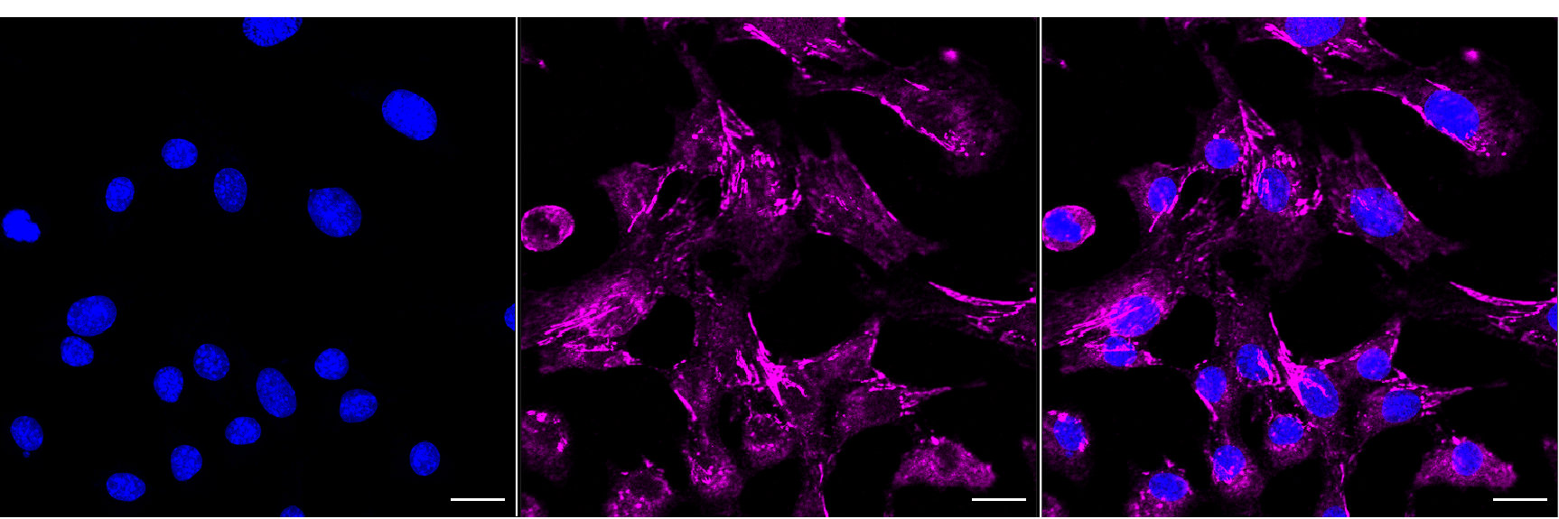 Immunocytochemical staining of C2C12 cells with Integrin alpha 5 antibody. Nuclei were stained blue with DAPI; Integrin alpha 5 was stained magenta with Alexa Fluor? 647. Images were taken using Leica stellaris 5. Protein abundance based on laser Intensity and smart gain: Medium. Scale bar, 20 μm.