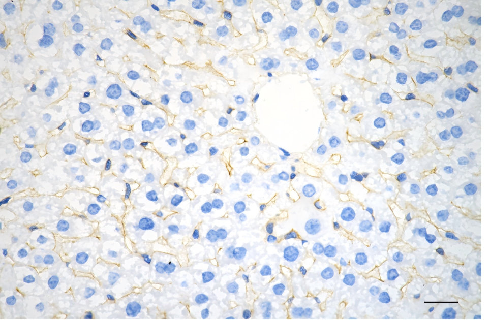 Immunohistochemistry was performed on paraffin-embedded mouse liver using integrin alpha 5 antibody. Antigen retrieval was done in sodium citrate buffer (pH 6.0). DAB was used for detection, with hematoxylin counterstaining. Images were acquired using a Nikon Ci-L Plus microscope (40× objective). Scale bar: 25 μm.