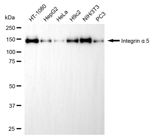 Western blotting analysis using integrin alpha 5 antibody. Total cell lysates (30 μg) from various cell lines were loaded and separated by SDS-PAGE. The blot was incubated with integrin alpha 5 antibody and HRP-conjugated goat anti-rabbit secondary antibody respectively.