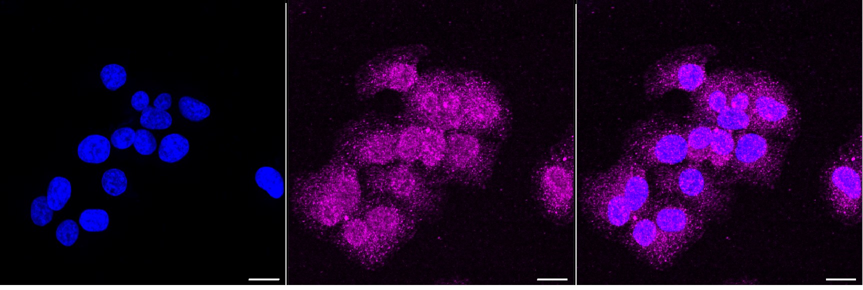 Immunocytochemical staining of HT-1080 cells with Integrin beta-1/CD29 antibody. Nuclei were stained blue with DAPI; Integrin beta-1/CD29 was stained magenta with Alexa Fluor? 647. Images were taken using Leica stellaris 5. Protein abundance based on laser Intensity and smart gain: Medium. Scale bar, 20 μm.