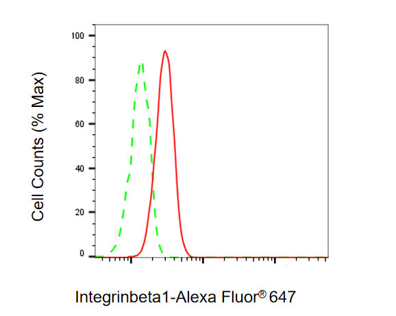 Flow cytometric analysis of Integrin beta 1 expression in HT-1080 cells using Integrin beta 1 antibody. Green, isotype control; red, Integrin beta 1.