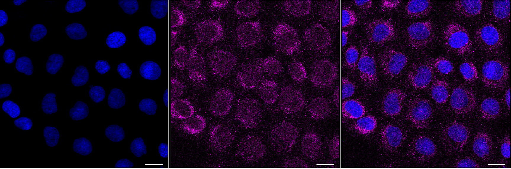 Immunocytochemical staining of HT-1080 cells with ITGB1 antibody. Nuclei were stained blue with DAPI; ITGB1 was stained magenta with Alexa Fluor? 647. Images were taken using Leica stellaris 5. Protein abundance based on laser Intensity and smart gain: Medium. Scale bar, 20 μm.