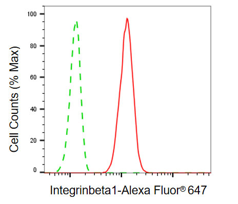 Flow cytometric analysis of integrin beta 1 expression in HT-1080 cells using integrin beta 1 antibody. Green, isotype control; red, integrinbeta1.