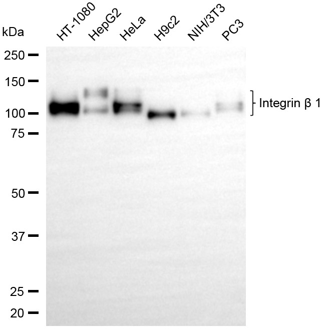 Western blotting analysis using integrin beta 1 antibody. Total cell lysates (30 μg) from various cell lines were loaded and separated by SDS-PAGE. The blot was incubated with integrin beta 1 antibody and HRP-conjugated goat anti-rabbit secondary antibody respectively.