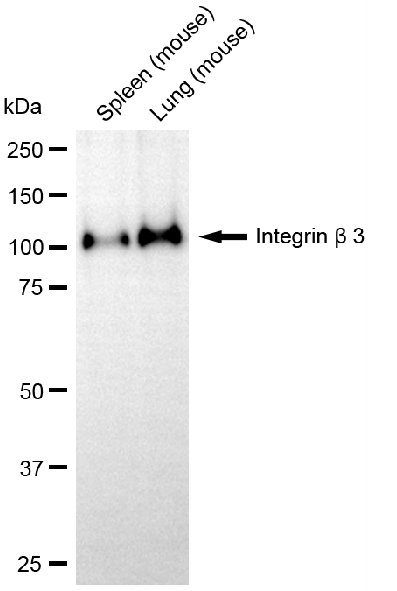 Western blotting analysis using integrin beta 3 antibody. Total cell lysates (50 μg) from various cell lines were loaded and separated by SDS-PAGE. The blot was incubated with integrin beta 3 antibody and HRP-conjugated goat anti-rabbit secondary antibody respectively.