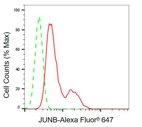 Flow cytometric analysis of JUNB expression in HepG2 cells using JUNB antibody. Green, isotype control; red, JUNB.