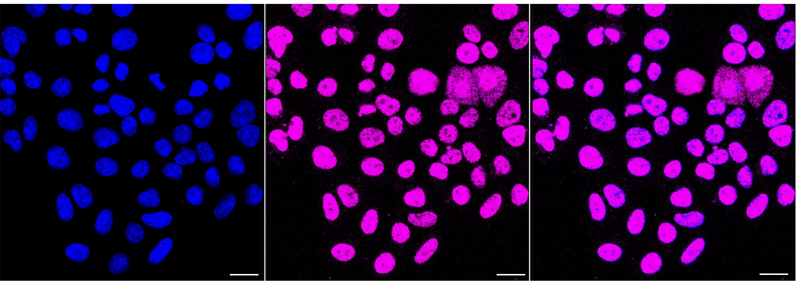 Immunocytochemical staining of HepG2 cells with JUNB antibody. Nuclei were stained blue with DAPI; JUNB was stained magenta with Alexa Fluor? 647. Images were taken using Leica stellaris 5. Protein abundance based on laser Intensity and smart gain: Medium. Scale bar, 20 μm.