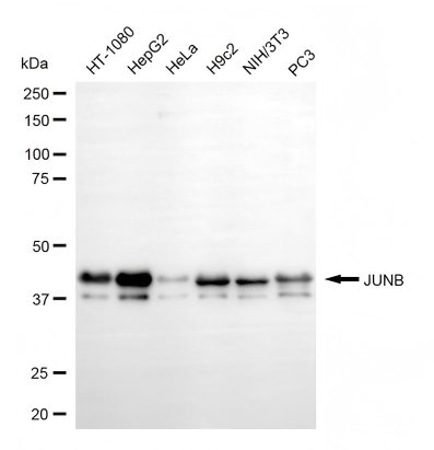 Western blotting analysis using JUNB antibody. Total cell lysates (30 μg) from various cell lines were loaded and separated by SDS-PAGE. The blot was incubated with JUNB antibody and HRP-conjugated goat anti-rabbit secondary antibody respectively.