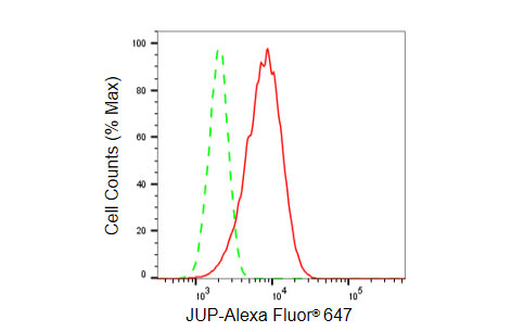 Flow cytometric analysis of JUP expression in HepG2 cells using JUP antibody. Green, isotype control; red, JUP.
