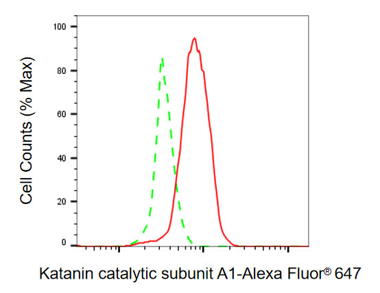 Flow cytometric analysis of katanin catalytic subunit A1 expression in Hela cells using katanin catalytic subunit A1 antibody. Green, isotype control; red, katanin catalytic subunit A1.
