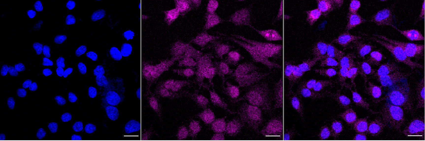 Immunocytochemical staining of Hela cells with katanin catalytic subunit A1 antibody. Nuclei were stained blue with DAPI; Katanin catalytic subunit A1 was stained magenta with Alexa Fluor? 647. Images were taken using Leica stellaris 5. Protein abundance based on laser Intensity and smart gain: Low. Scale bar, 20 μm.