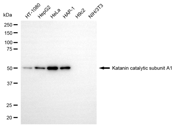 Western blotting analysis using katanin catalytic subunit A1 antibody. Total cell lysates (30 μg) from various cell lines were loaded and separated by SDS-PAGE. The blot was incubated with katanin catalytic subunit A1 antibody and HRP-conjugated goat anti-rabbit secondary antibody respectively.