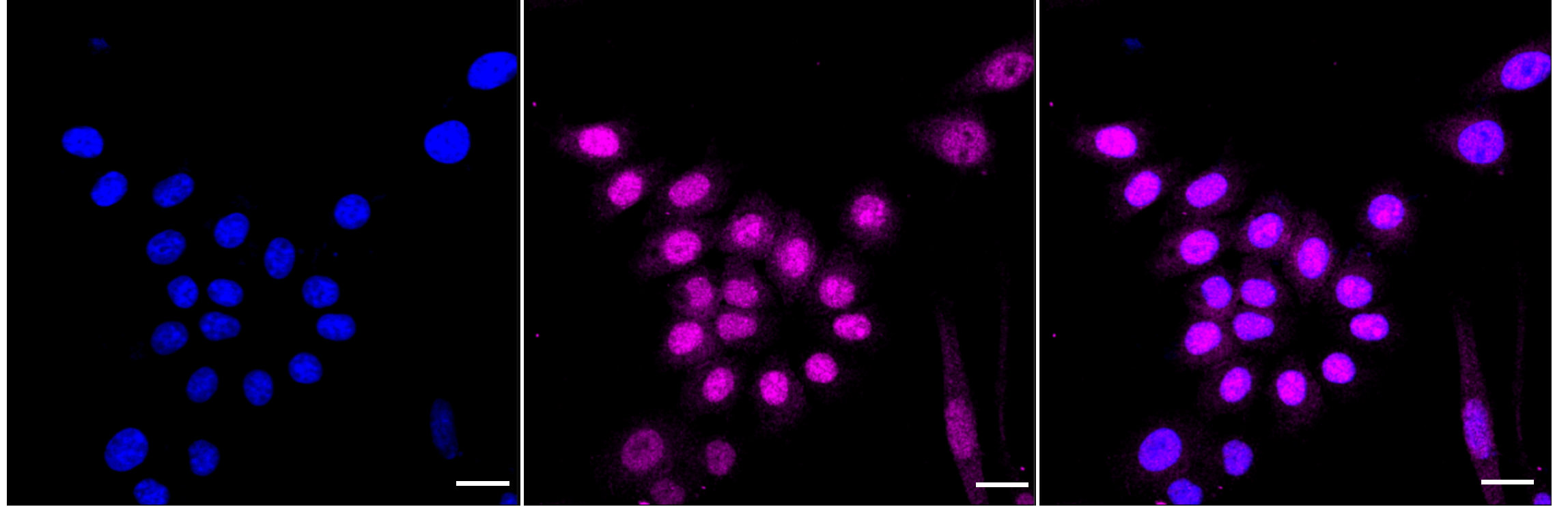 Immunocytochemical staining of HepG2 cells with Lysine demethylase 1A antibody. Nuclei were stained blue with DAPI; Lysine demethylase 1A was stained magenta with Alexa Fluor? 647. Images were taken using Leica stellaris 5. Protein abundance based on laser Intensity and smart gain: High. Scale bar: 20 μm.