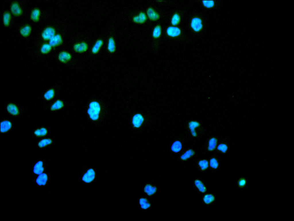 Immunofluorescence staining of HeLa cell with CSB-RA130887A0HU at 1:50 , counter-stained with DAPI. The cells were fixed in 4% formaldehyde, permeabilized using 0.2% Triton X-100 and blocked in 10% normal Goat Serum. The cells were then incubated with the antibody overnight at 4°C. The secondary antibody was Alexa Fluor 488-congugated AffiniPure Goat Anti-Rabbit IgG(H+L).