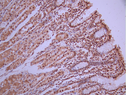 IHC image of CSB-RA130887A0HU diluted at 1:100 and staining in paraffin-embedded human stomach tissue performed on a Leica BondTM system. After dewaxing and hydration, antigen retrieval was mediated by high pressure in a citrate buffer (pH 6.0). Section was blocked with 10% normal goat serum 30min at RT. Then primary antibody (1% BSA) was incubated at 4°C overnight. The primary is detected by a Goat anti-rabbit polymer IgG labeled by HRP and visualized using 0.05% DAB.
