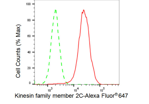 Flow cytometric analysis of Kinesin family member 2C expression in HAP-1 cells using Kinesin family member 2C antibody. Green, isotype control; red, Kinesin family member 2C.