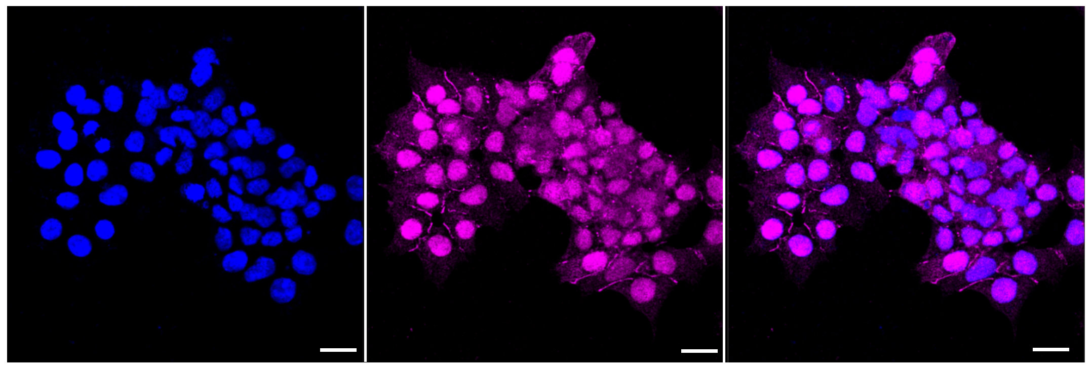Immunocytochemical staining of HAP-1 cells with Kinesin family member 2C?antibody. Nuclei were stained blue with DAPI; Kinesin family member 2C?was stained magenta with Alexa Fluor? 647. Images were taken using Leica stellaris 5. Protein abundance based on laser Intensity and smart gain: Medium. Scale bar: 20 μm.