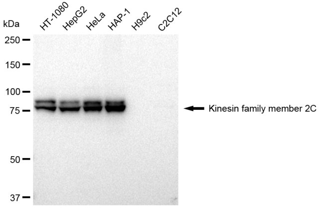 Western blotting analysis using Kinesin family member 2C antibody. Total cell lysates (30 μg) from various cell lines were loaded and separated by SDS-PAGE. The blot was incubated with Kinesin family member 2C antibody and HRP-conjugated goat anti-rabbit secondary antibody respectively.