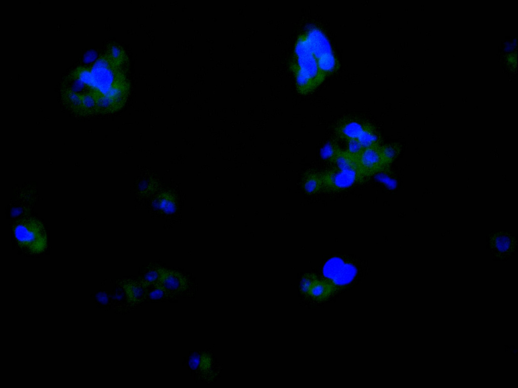 Immunofluorescence staining of HepG2 cell with CSB-RA266593A0HU at 1:50, counter-stained with DAPI. The cells were fixed in 4% formaldehyde, permeabilized using 0.2% Triton X-100 and blocked in 10% normal Goat Serum. The cells were then incubated with the antibody overnight at 4°C. The secondary antibody was Alexa Fluor 488-congugated AffiniPure Goat Anti-Rabbit IgG(H+L).
