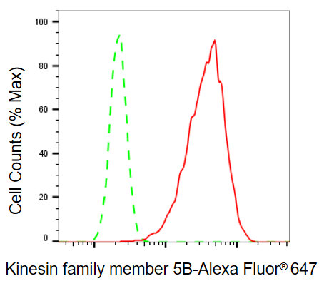 Flow cytometric analysis of kinesin family member 5B expression in C2C12 cells using kinesin family member 5B antibody. Green, isotype control; red, kinesin family member 5B.