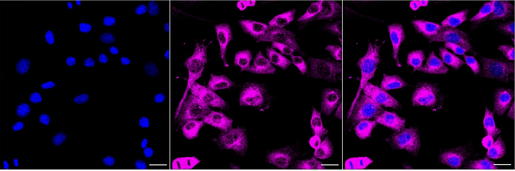 Immunocytochemical staining of C2C12 cells with Kinesin family member 5B antibody. Nuclei were stained blue with DAPI; Kinesin family member 5B was stained magenta with Alexa Fluor? 647. Images were taken using Leica stellaris 5. Protein abundance based on laser Intensity and smart gain: Medium. Scale bar, 20 μm.
